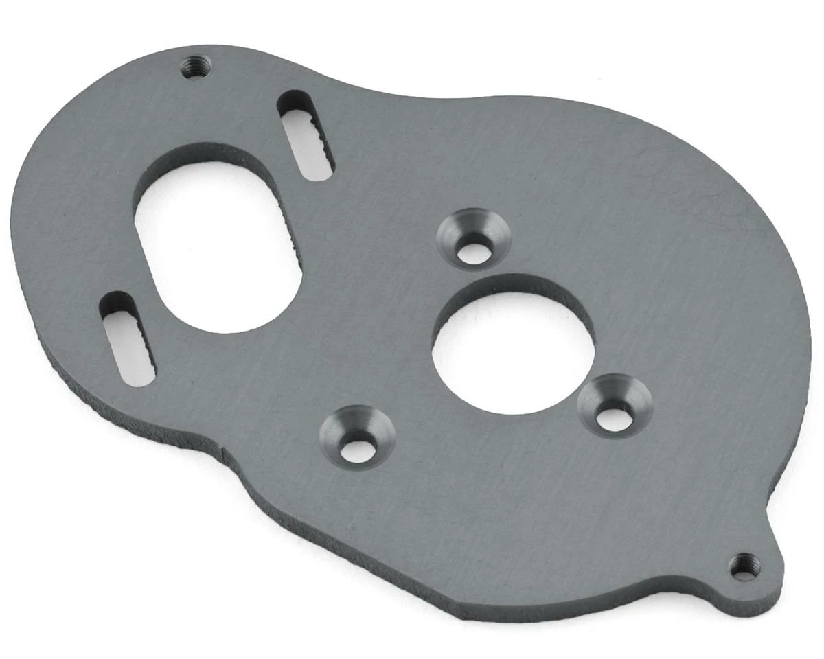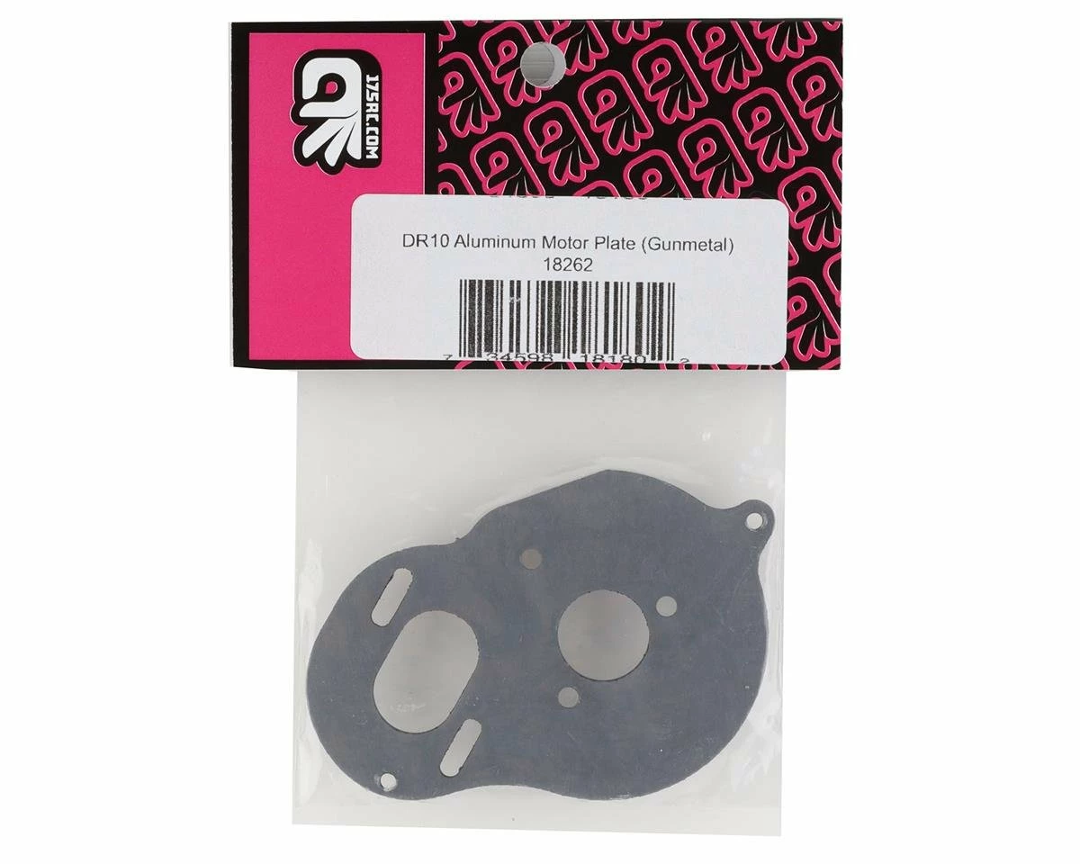175RC Associated DR10 Aluminum Motor Plate. This optional motor plate is anodized gunmetal grey and is intended for the Team Associated DR10. Package includes one optional motor plate.