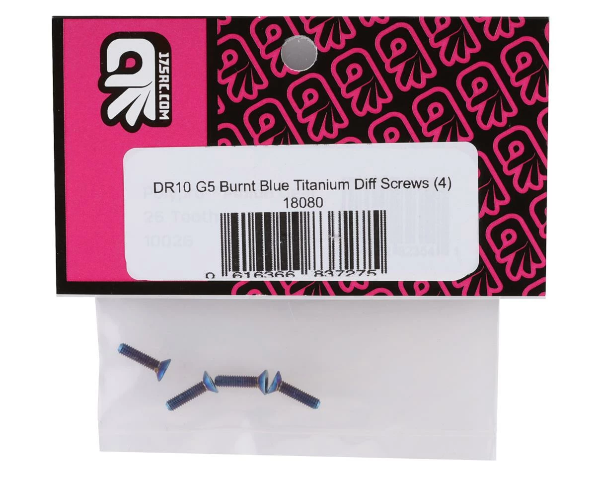 175RC DR10 G5 Titanium Differential Screws are a lightweight upgrade for the Associated DR10 gear differential. Package includes four 2.5x10mm flat head screws.