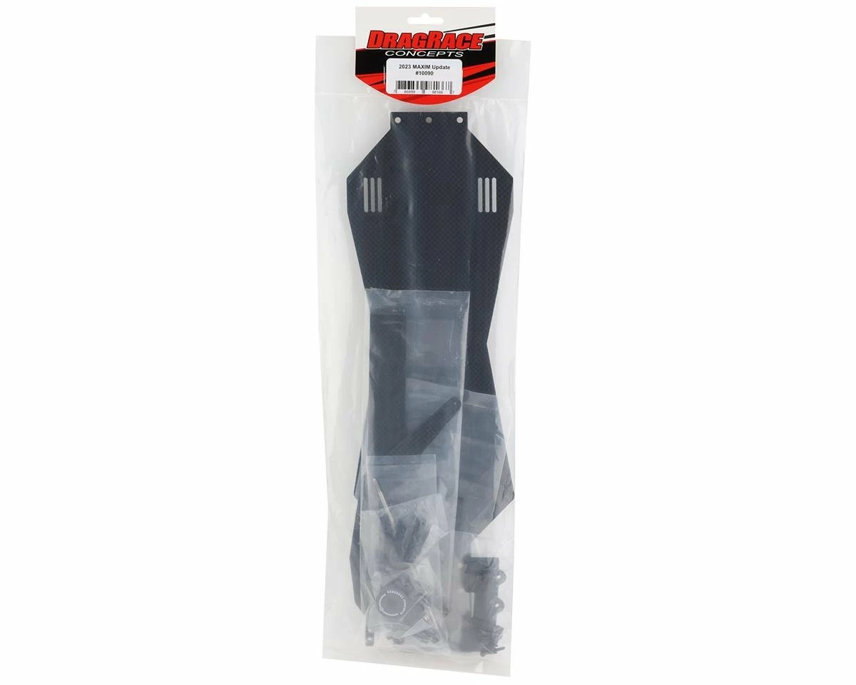 This is the DragRace Concepts 2023 Maxim Conversion Kit. Starting with the successful Maxim chassis DragRace Concepts has created high performance update allowing you to improve an already incredibly competitive platform. Using an updated 3mm carbon chassis plate the 2023 Maxim has removed the chassis stiffeners increasing the flexibility of the chassis making launches more consistent. This chassis flex gives users the ability to tune the vehicle more aggressively without loosing traction. DragRace Concepts has also taken into account that drag racing batteries have become larger and space is at a premium. This chassis plate has been widened to accept these larger batteries without fitment issues.