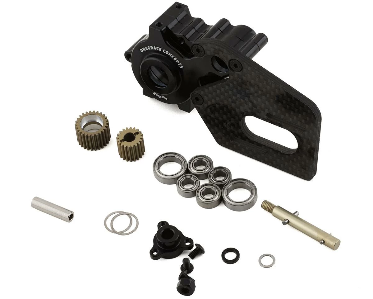 DragRace Concepts Kingpin Complete Transmission Set. This replacement transmission set is intended for the DragRace Concepts Maverick, however, it will also work with the Team GFRP Apollo drag car. With a housing made of 7075 T6 aluminum, full aluminum internal gears and the Kingpin Loaded Differential this transmission is ready to hold serious horsepower. The Kingpin Transmission is based on the Team Associate B6.1 transmission housing and features a 2.60 final gear ratio (20/26/52). Used to replace, upgrade or have a spare, the DragRace Concepts Kingpin Transmission Set is ready to go from A to B.