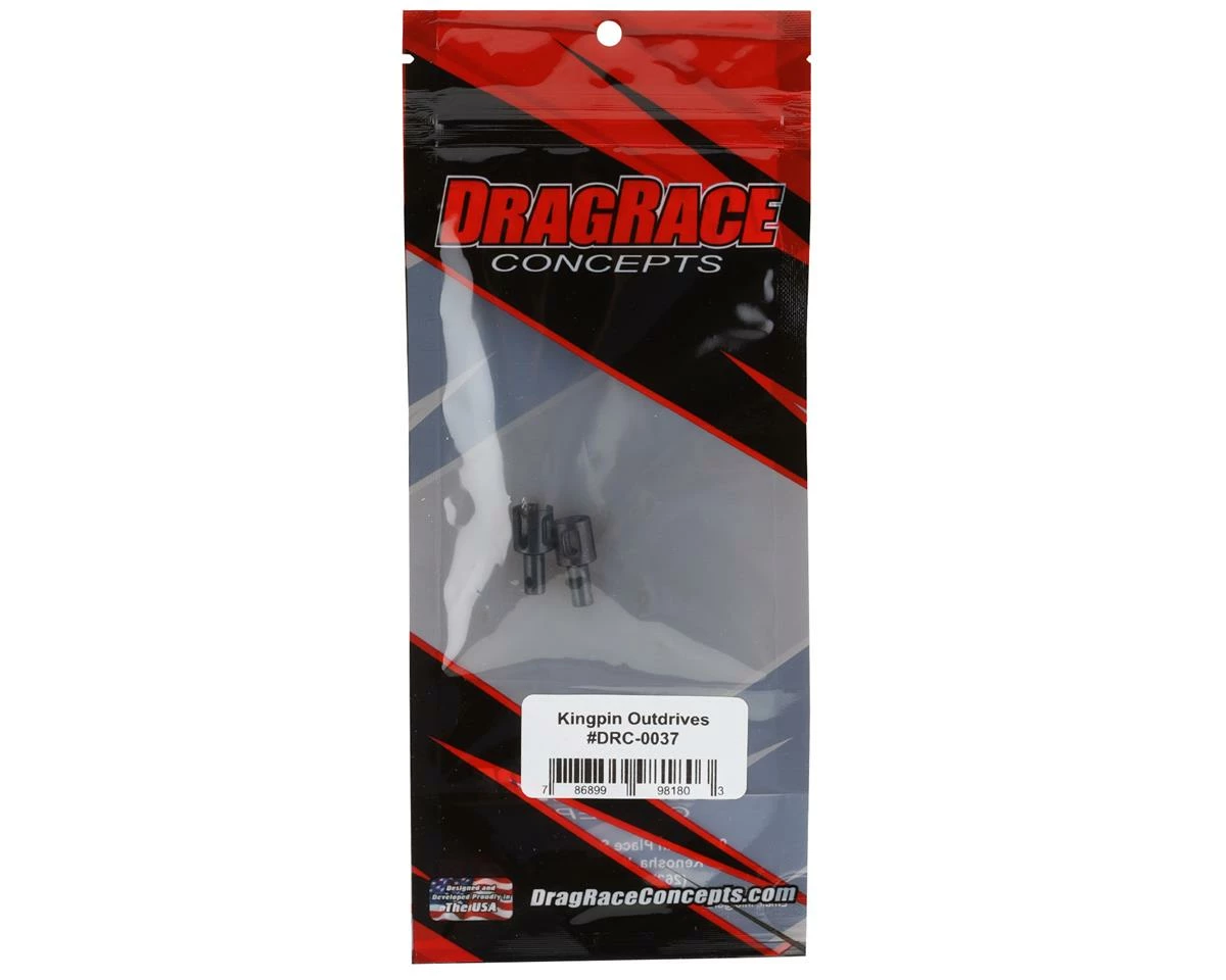 DragRace Concepts Kingpin Steel Outdrives. These replacement outdrives are intended for the DragRace Concepts Maverick, however, it will also work with the Team GFRP Apollo when equipped with the optional Kingpin Transmission Set (DRC-0039). Package includes two steel outdrives.