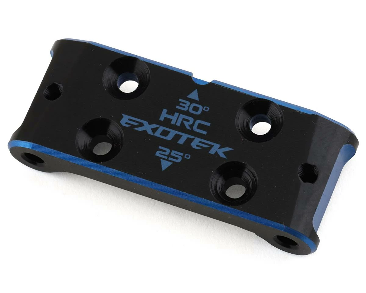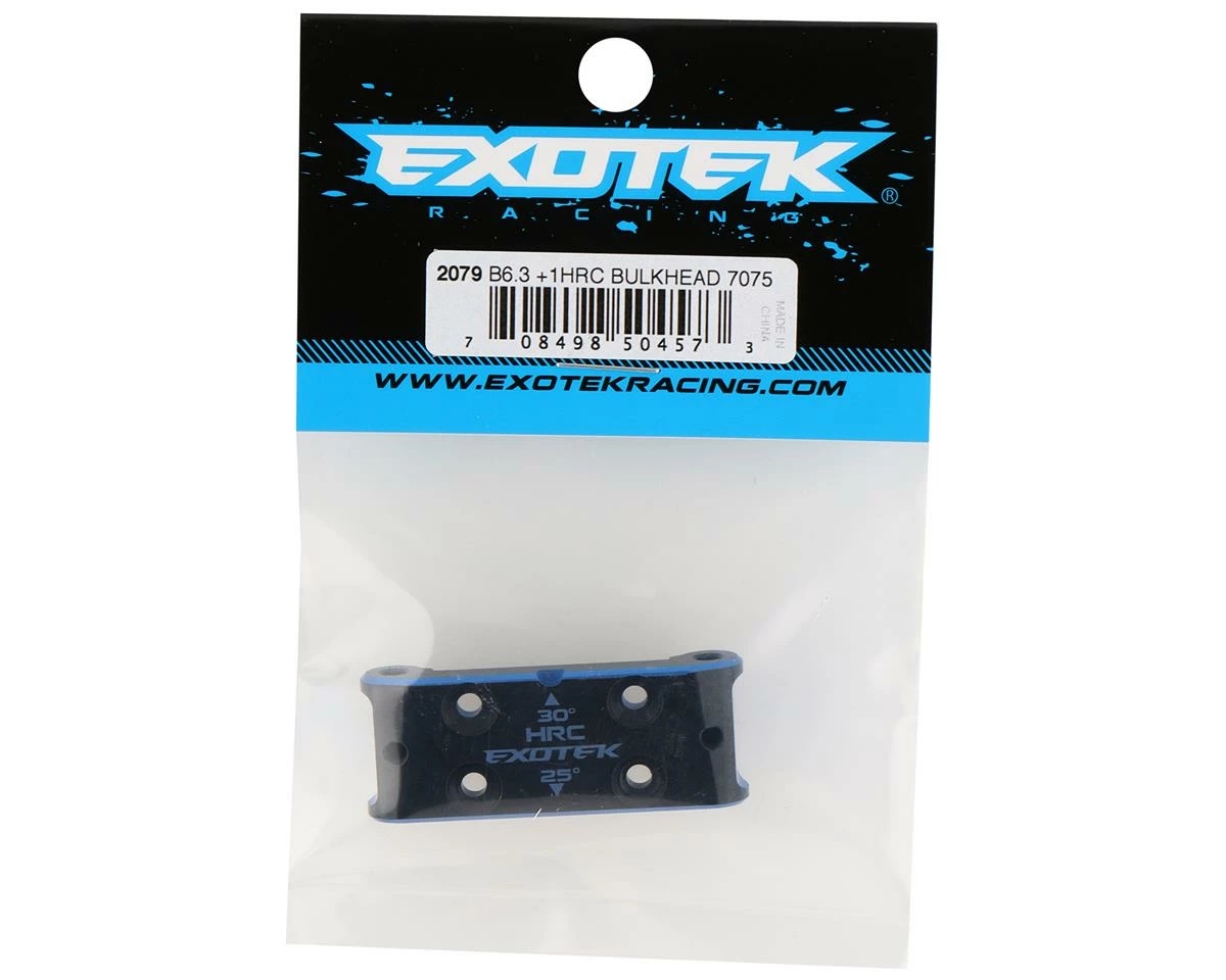 The Exotek Associated B6.3/T6/SC6 Aluminum Bulkhead High Roll Center is a great option that raises the inner hinge pins by 1mm. This bulkhead features 25° or 30° kick up settings, depending on mounting direction, and weighs 10 grams. Plus, the stealthy black polished base with blue chamfered accents compliments both the stock plastic or after market blue parts perfectly. Package includes one bulkhead intended for the Team Associated RC10B6.3, T6 or SC6.