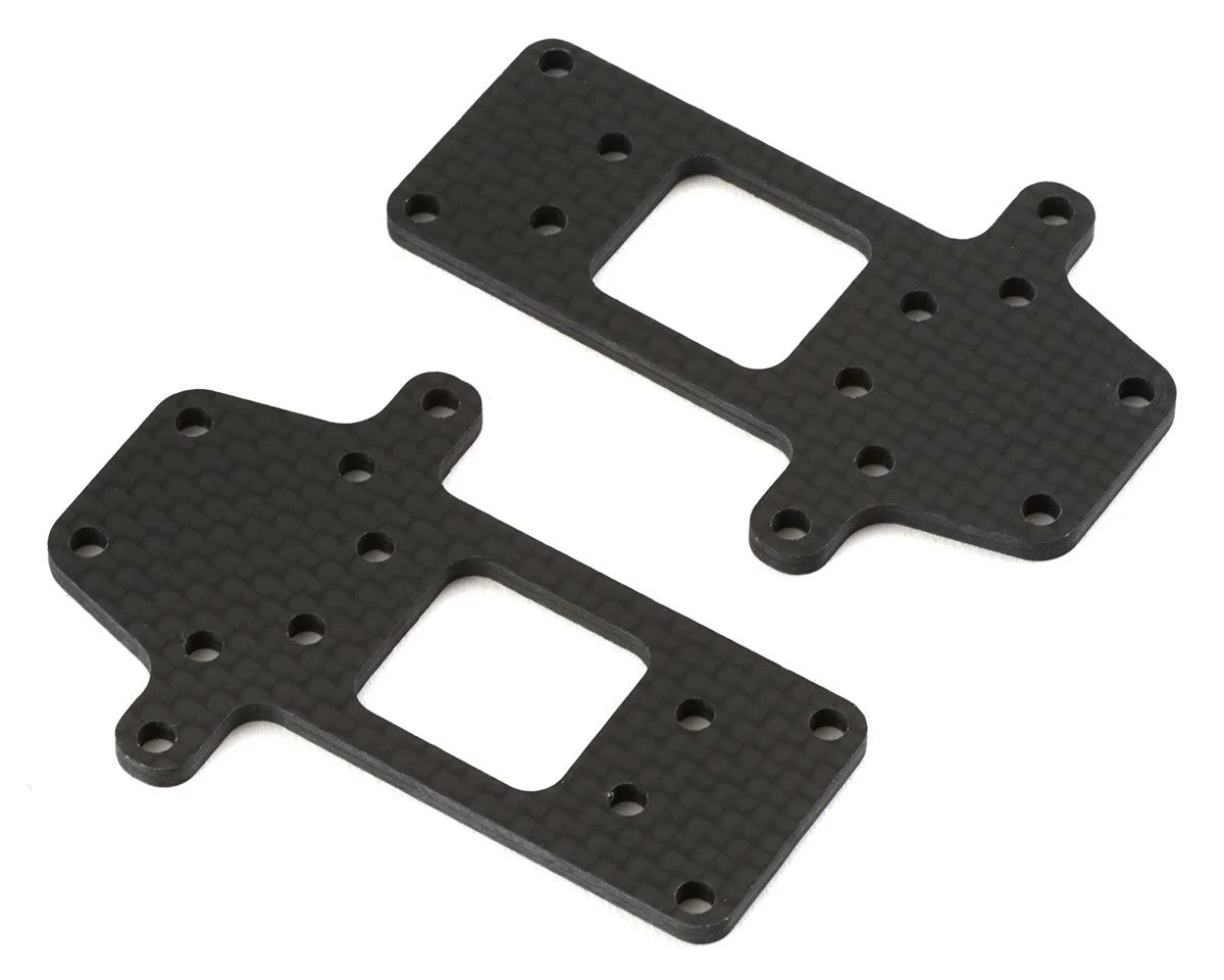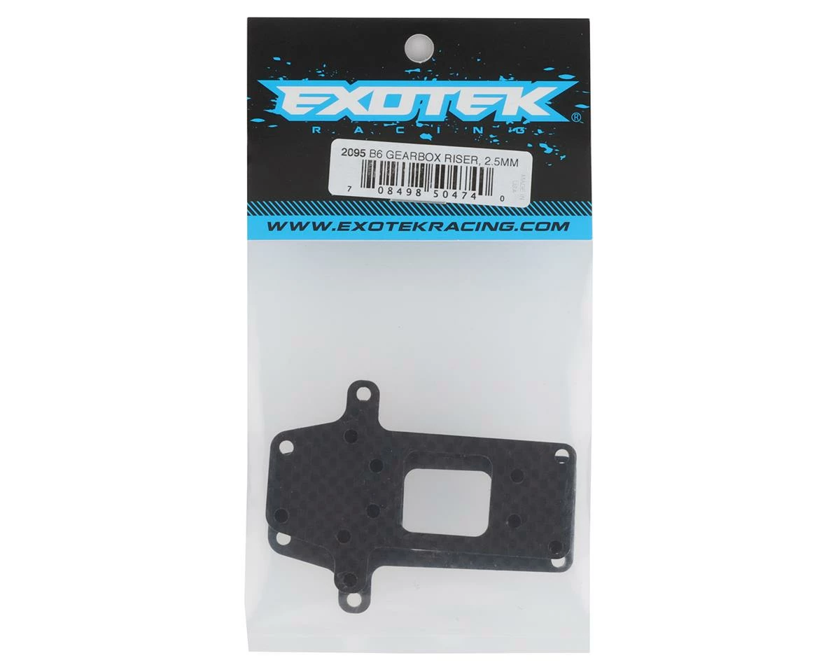 The Exotek B6 2.5mm Carbon Fiber Gear Box Riser Spacers offer the ability to raise the gearbox on the B6.1-B6.4 platform. By raising the laydown/layback gearboxes of the B6 platform the dog bone angle sits straighter when at ride height reducing stress and friction. Another additional benefit is the option to run a larger spur gear giving the user more options. Package includes two 2.5mm carbon fiber spacers.