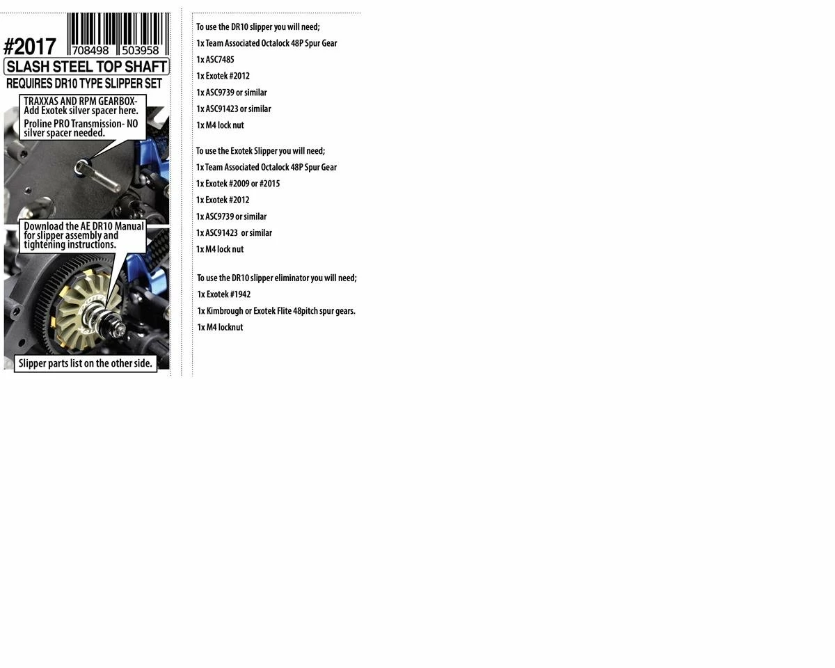 The Exotek Slash Steel Top Shaft is a heavy duty steel top shaft option that allows the use of optional DR10 slipper systems in 2wd Slash based drag car applications. This makes it easy to upgrade the stock Slash slipper with a DR10 slipper, the Exotek MK3 Turbine Slipper (EXO2015), or Exotek slipper eliminator (EXO1942).