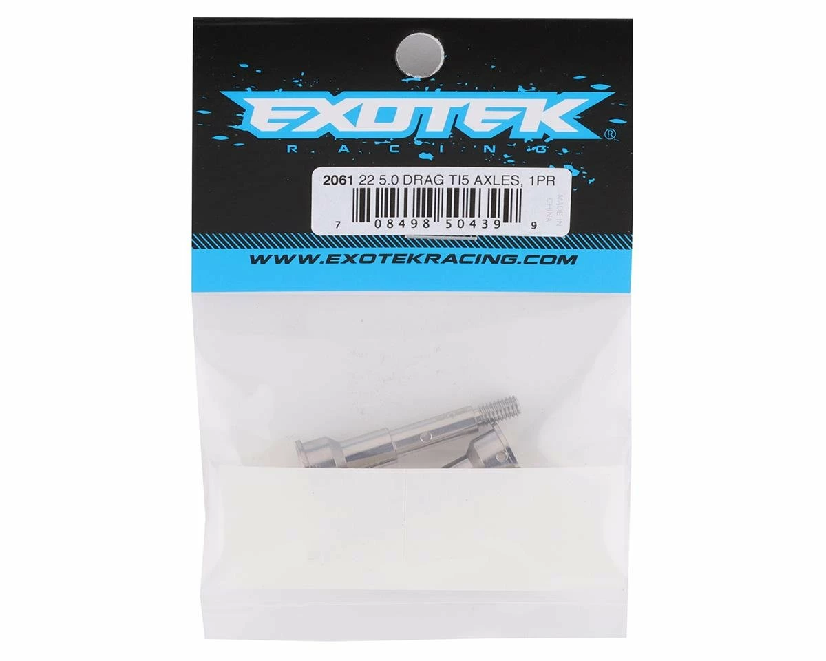 Exotek TLR 22 5.0 Titanium Lightweight Rear CVA Axles are a super light titanium axle option for Losi 22 5.0 drag conversions. Reduces the weight and rotating mass of your driveline for quicker acceleration. These axles weigh just 4.2 grams each, and are over 40% lighter than the stock steel axles.