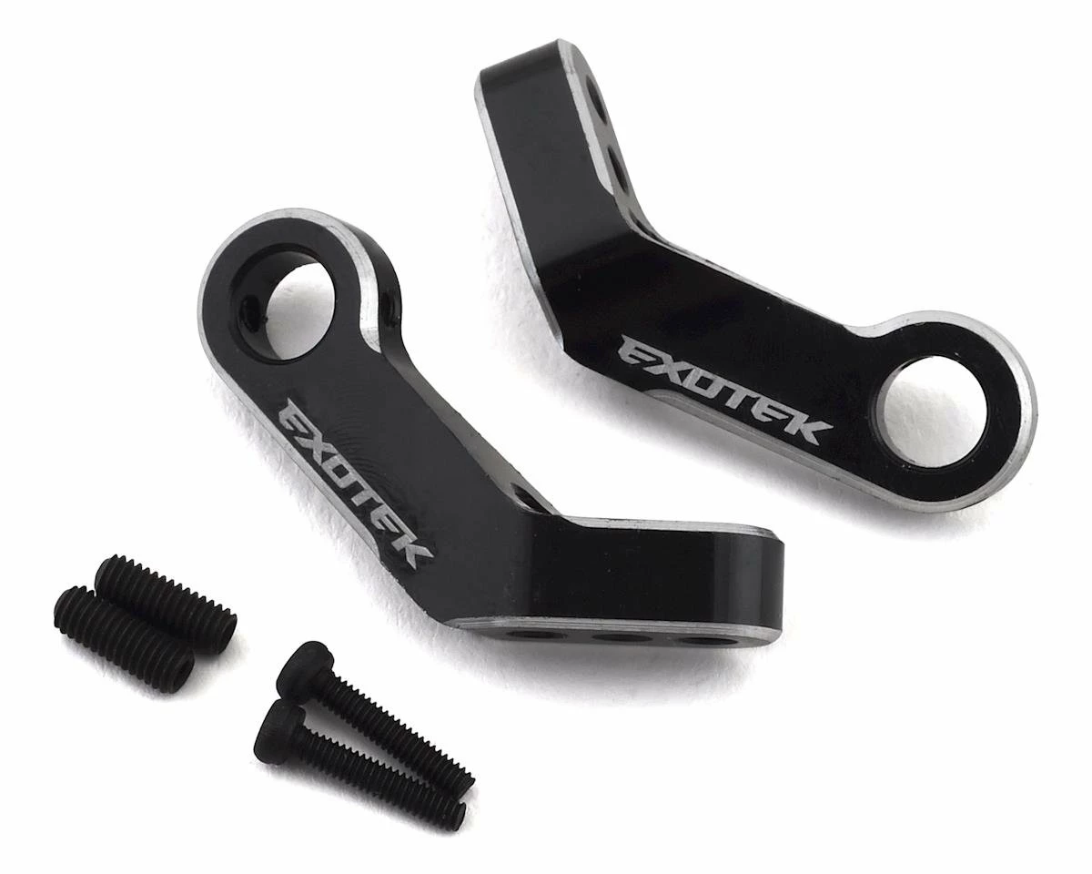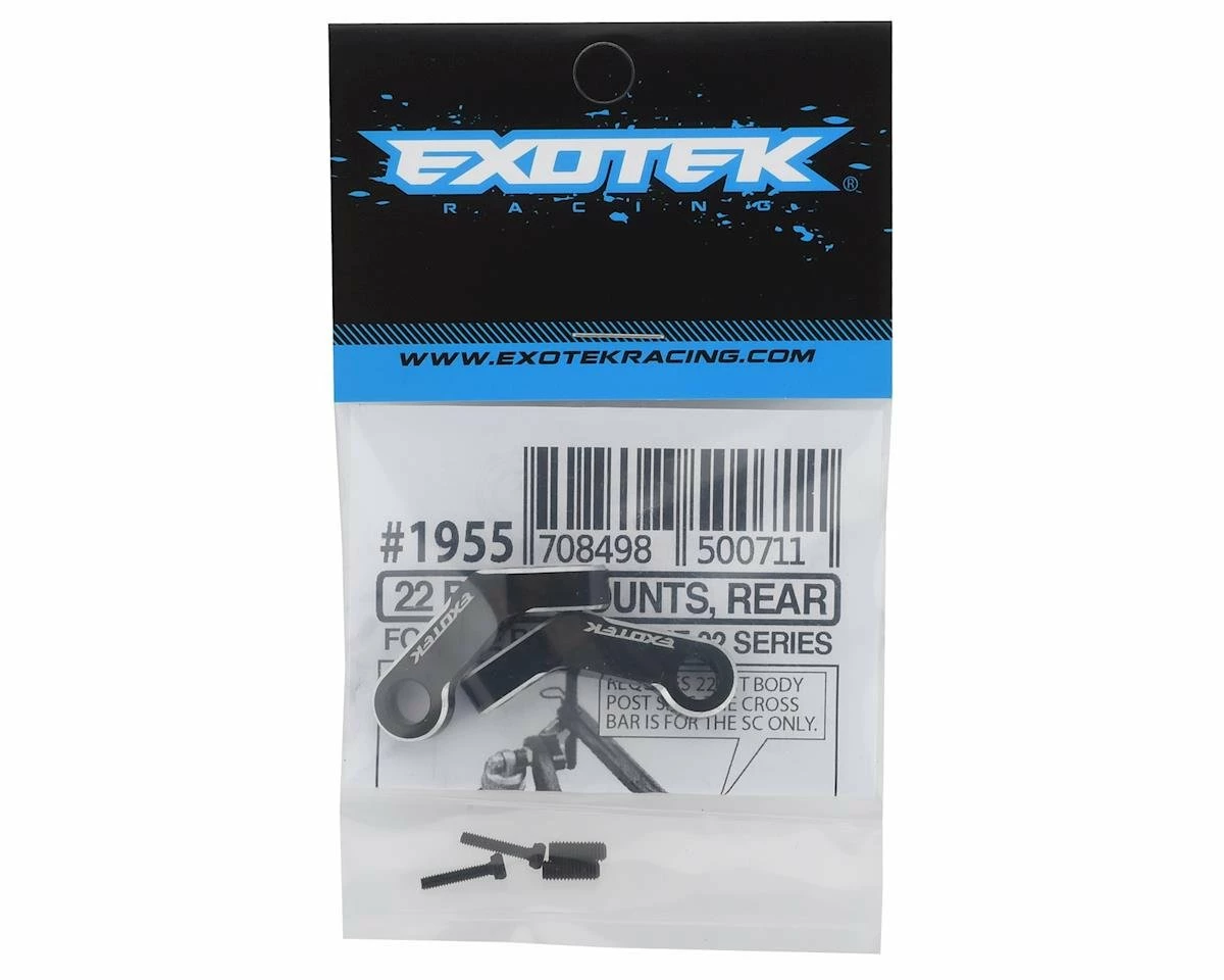 The Exotek TLR 22 Drag Racing Rear Body Mount provides a simple, strong and light rear body mount system for the rear of your 22 buggy converted to a no prep drag car, and 22SCT 3.0 models. The mounts are machined from 7075 aluminum and anodized black with silver chamferred edges, and weigh in at 8.6 grams for the set (the stock SCT body system weighs 21gr). They line up with the stock shock tower holes, attaching directly to the quick change shock posts so you can still use any shock tower holes for your shocks. Uses the stock 22SCT body posts (not included).