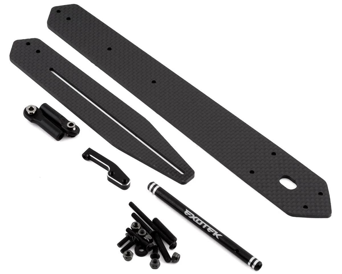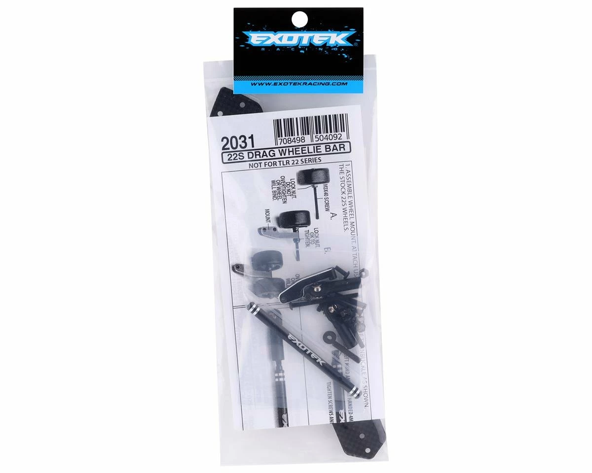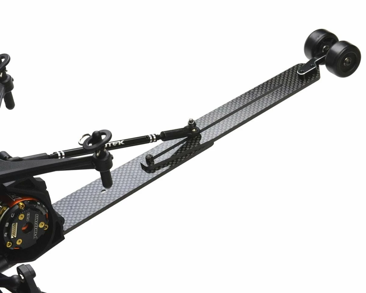 The Exotek 22S Drag Carbon Adjustable Flat Wheelie Bar is an extra long adjustable carbon fiber wheelie bar option for the Lost 22S Drag car. This bar is adjustable and extends from 9.5″ to 12″ (axle to axle), providing a greater level of tuning options compared to the stock bar. The longer bar gives you more stability, for straighter and faster passes without needing to let off the throttle as often compared to the stock short bar.