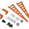 The flat bar design provides limited upwards flexing which acts like a shock for softer landings on the wheelie wheels. You are able to finely adjust the wheel height via the 4mm turnbuckle or make large adjustments by adding spacers under the wheel (M3 spacers not included). Made of heavy duty 3mm carbon fiber with alloy turnbuckles and mounts and mounts to the stock chassis and motor guard. Wheelie bar wheels not included. Requires use of the stock 22S Drag wheelie bar wheels (LOS231079).