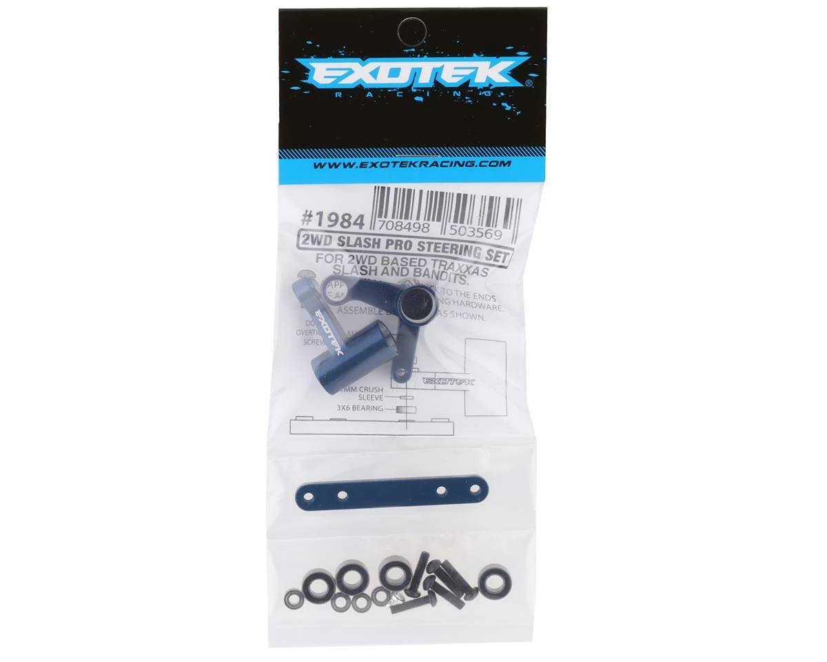 The Exotek Traxxas Slash Aluminum Pro Steering Set is a precision upgrade for the Traxxas 2wd based Slash, Bandit, trucks and street eliminator based builds! The design features optimized geometry, designed to reduce bump steer and provide quick crisp steering response. This is one of the smoothest, most precise and durable steering systems you can bolt on your ride. Includes a full set of ball bearings (4- 3x6mm, 4 5x10mm) and special crush shims which are at the heart of the slop free design.