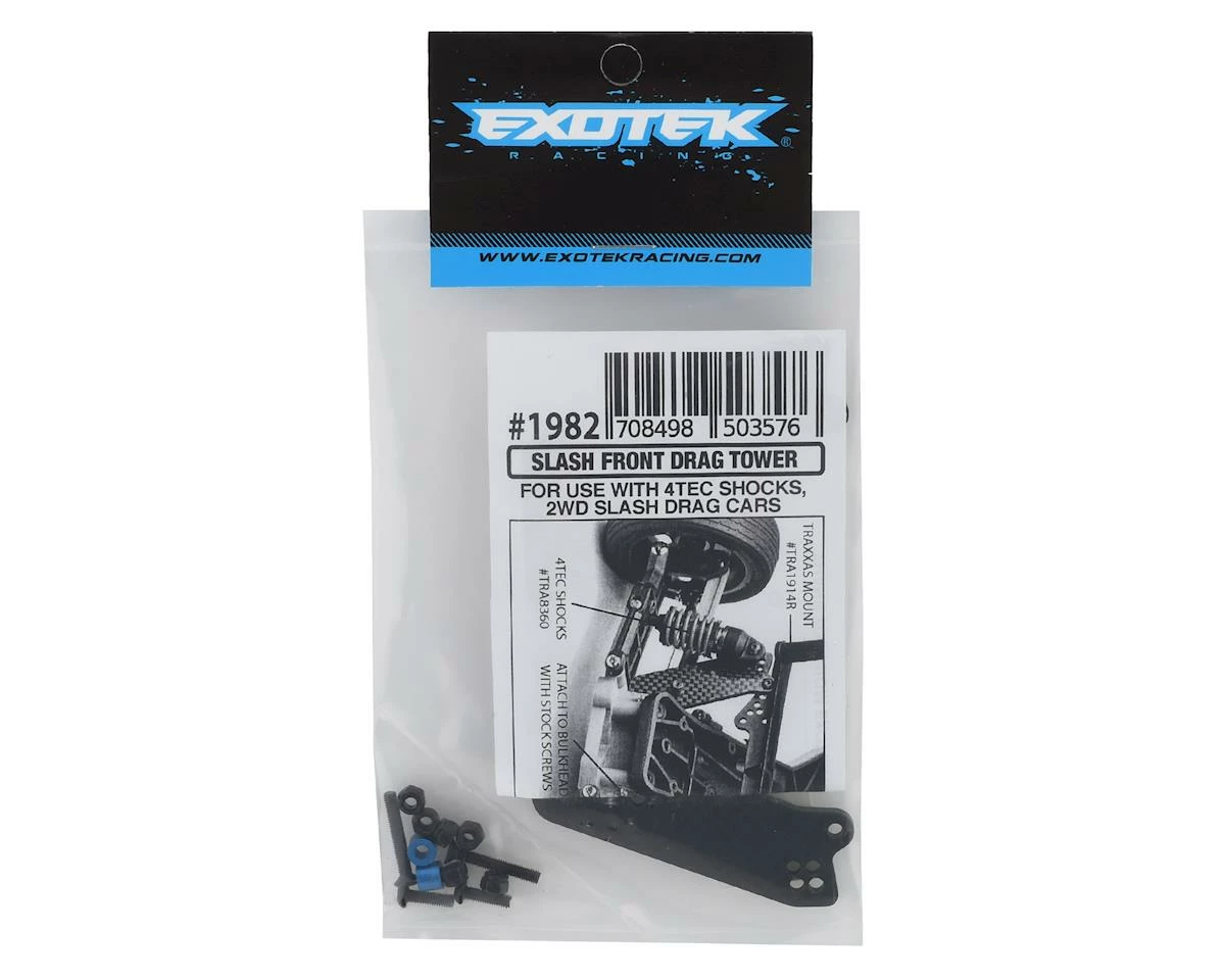 This is an Exotek Short Traxxas Slash Carbon Front Tower, a low profile, low ride height, heavy duty 3.5MM thick carbon fiber front shock tower for 2wd Slash street eliminator cars. A lower tower set-up allows you to mount the body to the lower levels desired with drag racing by using the Traxxas body post set (TRA1914R). Use the Traxxas 4tec shocks (requires TRA8360) to lower the front ride height.
