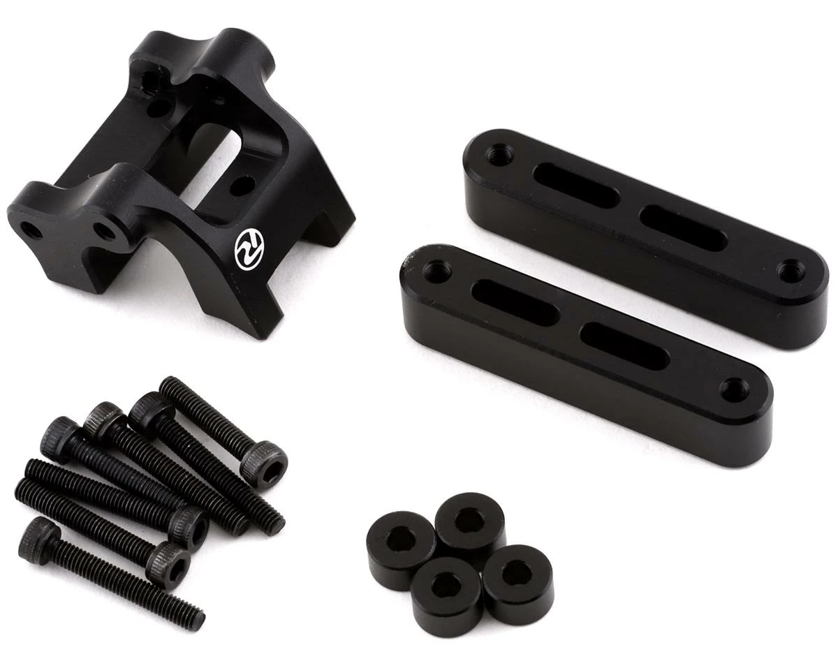The R-Design 22 Stand Up Transmission Wheelie Bar Mount V2 is a machined 6061-T6 aluminum option will allow mounting of a Traxxas style wheelie bar onto the Losi 22 3.0, 4.0 and 5.0 models equipped with the Standup transmission. The V2 is significantly lighter design than the V1 Mount and is compatible with the stock wing mount. The V2 also has a larger vertical adjustment range in the side bars because of the offset slot locations. Package includes grade 12.9 metric hardware for installation.