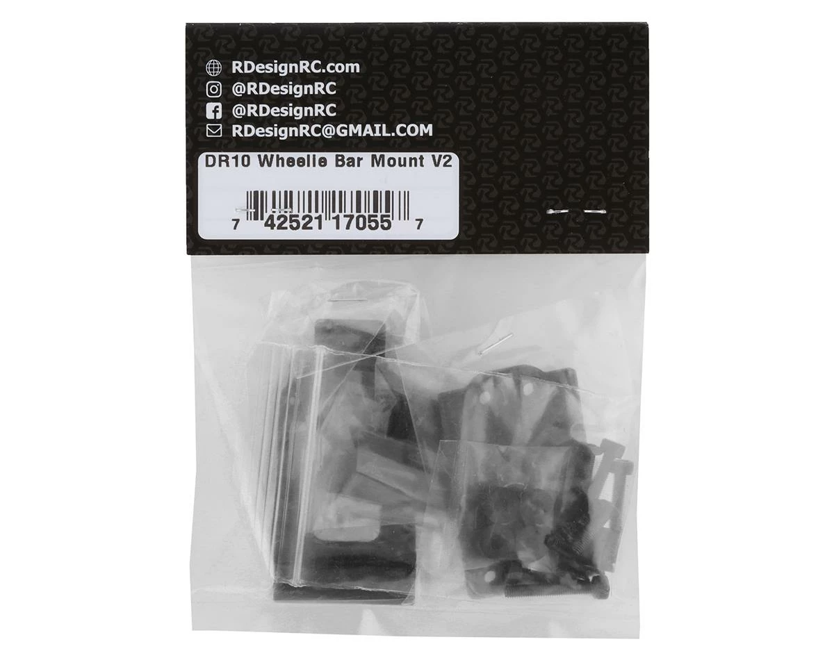 The R-Design DR10 V2 Wheelie Bar Mount is a machined 6061-T6 aluminum and carbon fiber option that replaces the stock plastic DR10 motor guard and creates a stiffer mounting location for a Traxxas compatible wheelie bar. The V2 mount weighs 54 grams making it lighter, and has a larger vertical adjustment range than the V1 because of the offset vertical adjustment slots. Another benefit is the ability to mount a 30mm fan mount directly above the motor.