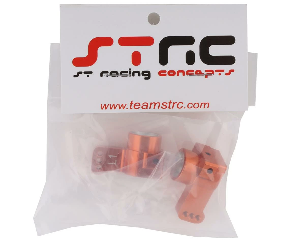 This is a set of ST Racing Concepts DR10 Aluminum Rear Hub Carriers with 1° Toe, two CNC machined aluminum rear hub carriers intended for use with the Team Associated DR10 Drag Car. These optional parts offer a strength improvement over stock that also adds a pop of color. Available in bright anodized blue, black, gunmetal grey and orange.