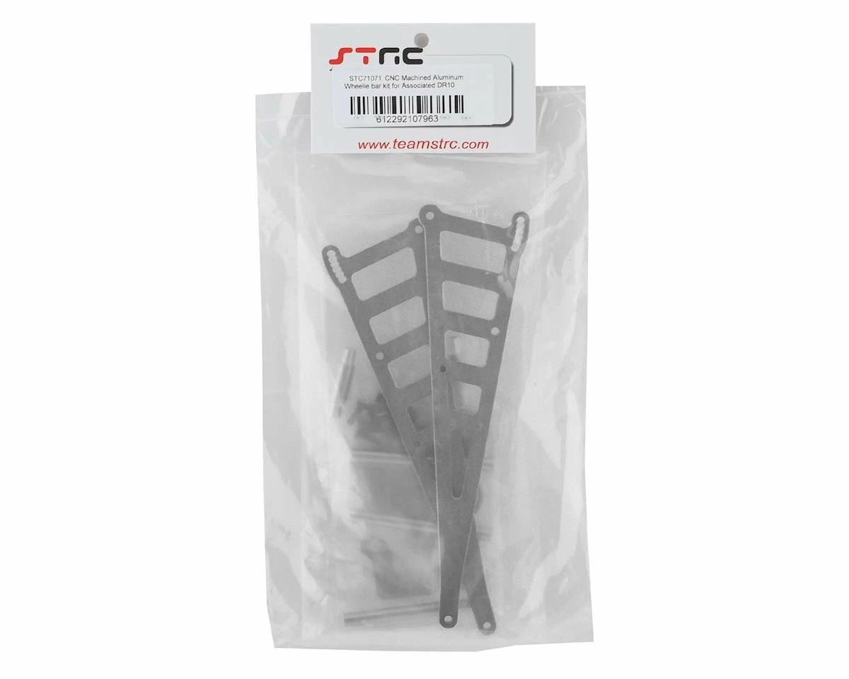 The ST Racing Concepts DR10 Aluminum Wheelie Bar Kit is now available for the popular Team Associated DR10 Dragster. ST Racing Concepts has CNC Machined this aluminum wheelie bar kit, giving it seven inches in length with an adjustable angle, double or single wheel setup options, and a solid aluminum ladder frame construction. This kit sits at a wider stance and longer length over the stock wheelie bar kit, giving it more stability. The silver anodized coating gives your build a flashy finish. The wheels are of high quality bearings for low friction and smooth rotation with low drag.