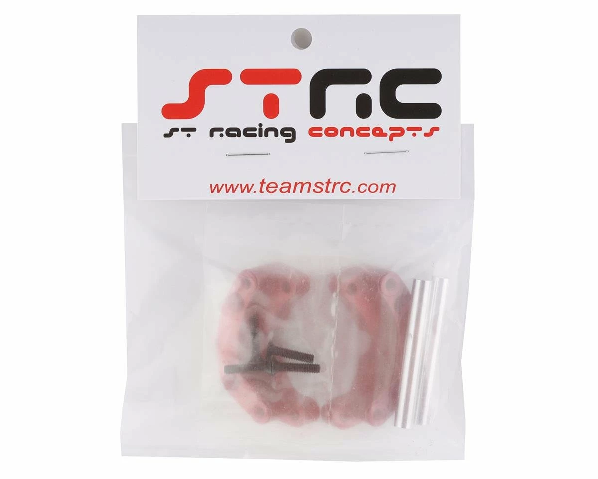 The ST Racing Concepts Traxxas Drag Slash Aluminum Rear Wheelie Bar Mount is a great performance part for the Traxxas Drag slash. Using this will more securely hold the wheelie bar and eliminate unwanted flex. This will also add a small amount of rear weight aiding in traction. Package includes two red mounts, two silver braces and hardware.