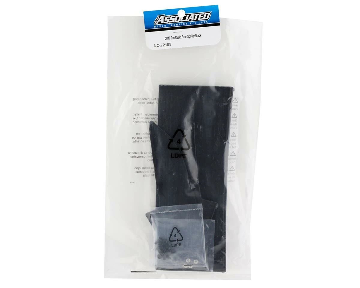 Team Associated DR10 Pro Reakt Spoiler. This is a pre-painted replacement wing set for the DR10 Pro Reakt body (ASC72033, ASC72035). Package includes spoiler components and hardware.