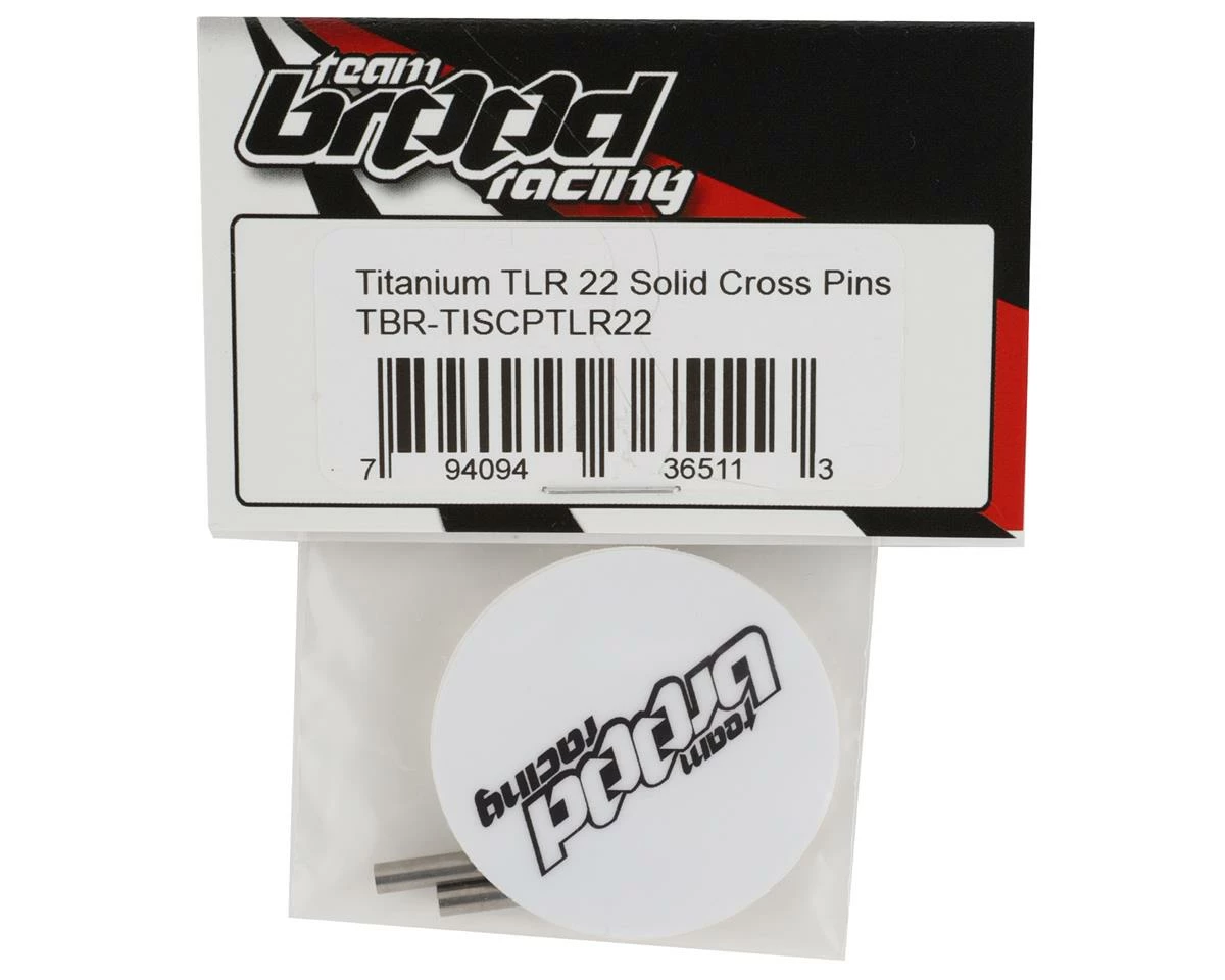 Team Brood TLR 22 Lightweight Titanium Gear Differential Solid Cross Pins. These optional cross pins are designed to be stronger than aluminum pins while being lighter than steel pins. Designed specifically for two-gear setups in the TLR 22, these are made to much tighter tolerances to provide superior gear mesh. These pins are a great choice for everyone from the weekend racer to the high horsepower drag builds. Package includes two solid titanium differential cross pins.