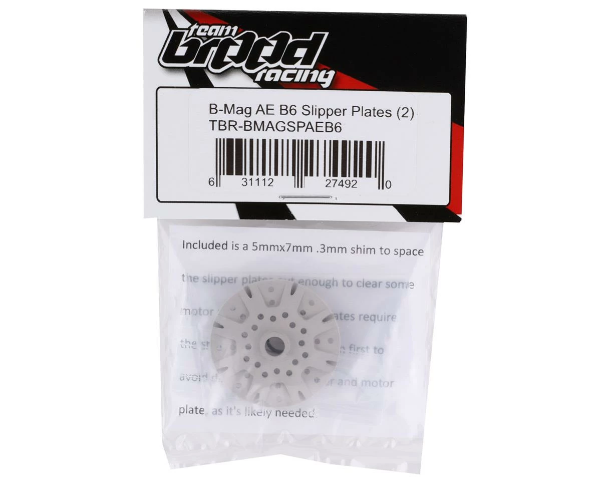 Team Brood B-Mag AE B6 Magnesium Slipper Plates are the ultimate slipper upgrade for stock class racing. Weighing in at 4.4 grams for the pair, these are much lighter than stock plates, but just as strong. Recommended for Stock class off road racing and 13.5 class no prep drag racing in Associated B6 and T6 applications that use ASC91803/ASC91804, these slipper plates are a great way to shed rotating mass from your drivetrain and reduce horsepower loss. The plates are MAO coated to create a durable surface that will remain hard and smooth. Plus, the increased venting and heatsink design helps to provide efficient heat dissipation and slipper consistency.